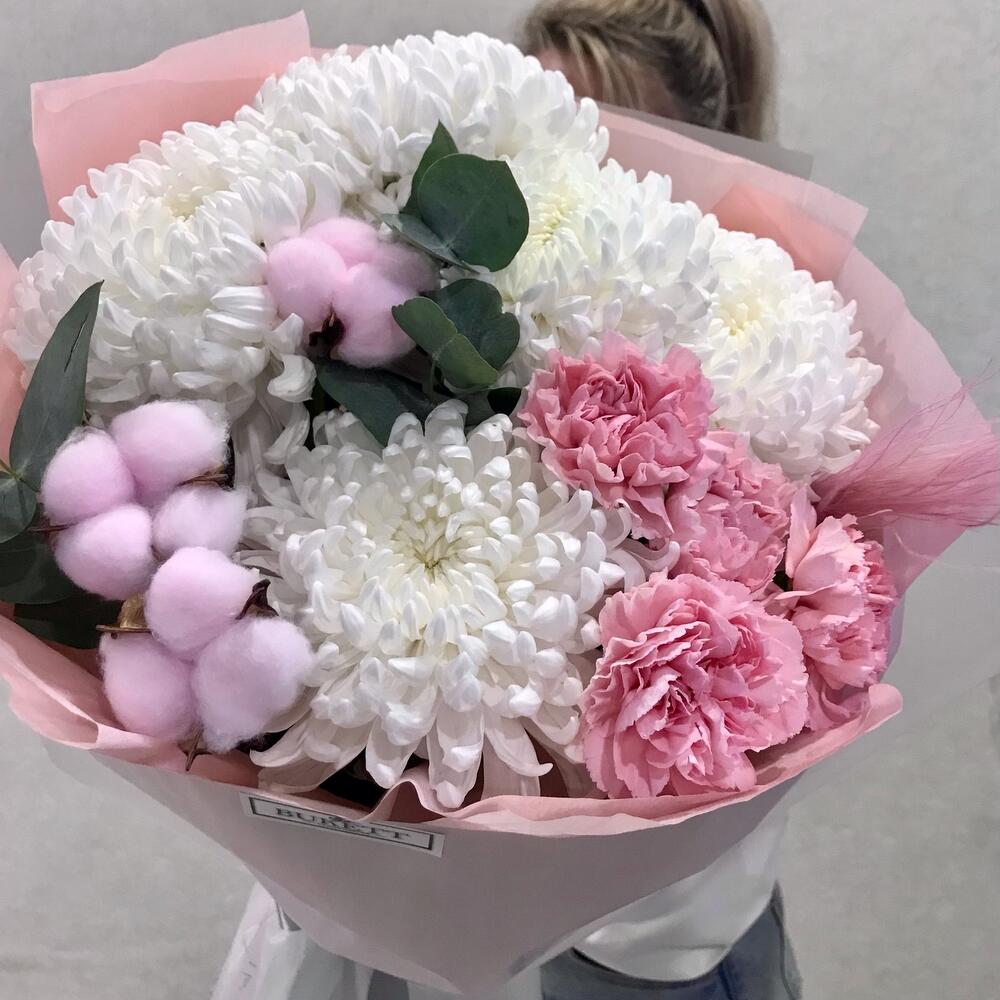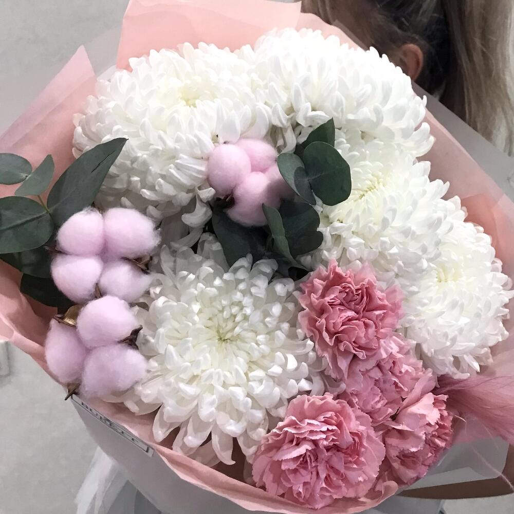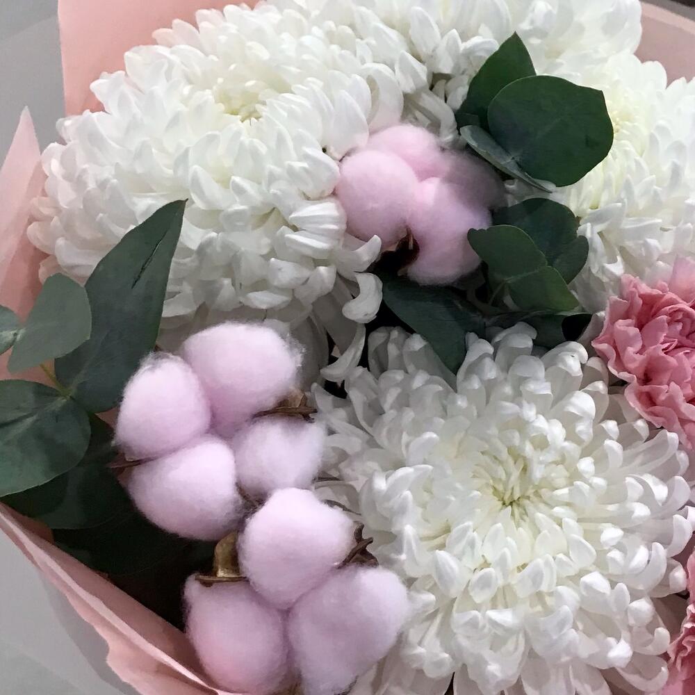 Хлопок - 3 шт. Эвкалипт - 3 шт. Лента атласная - 1 шт. Диантус - 4 шт. Органза - 1 шт. Открыточка с вашими пожеланиями - 1 шт. Дизайнерская упаковка - 2 шт. стифа пучок - 1 шт. хризантема одноголовая крупная - 5 шт.